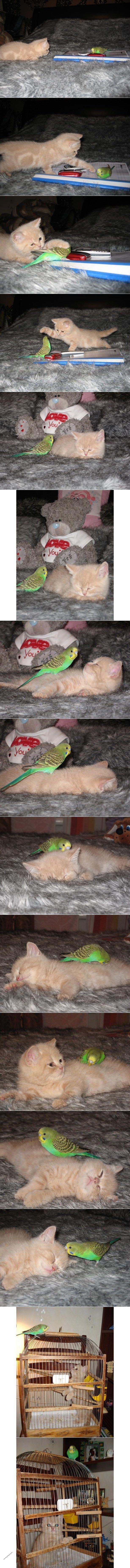 Wahre Freundschaft unter einem Vogel und einer kleinen Katze!